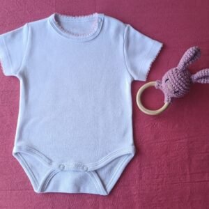 Body RN Blanco Línea «Mimando un Nuevo Corazón» con lazos y picots varios colores. Sonajero Amigurumi