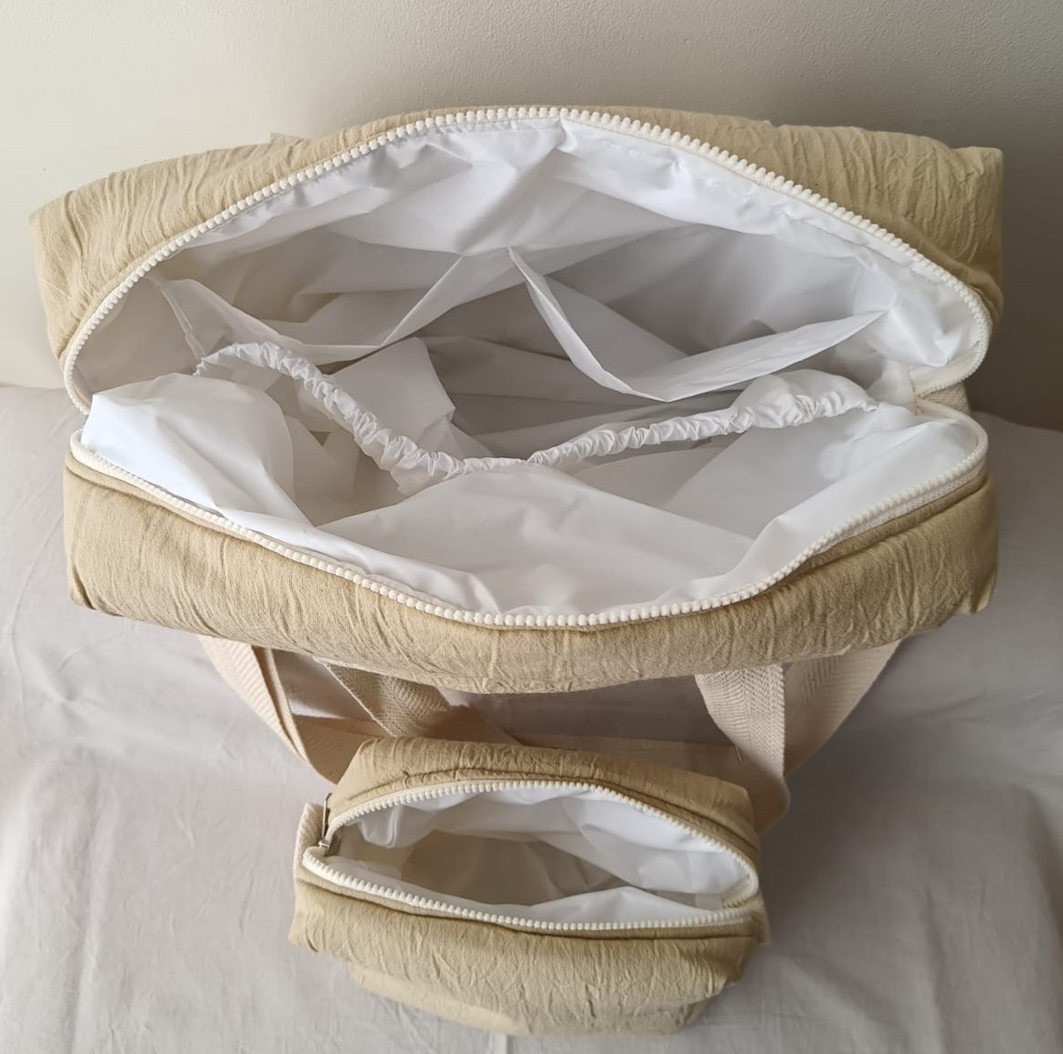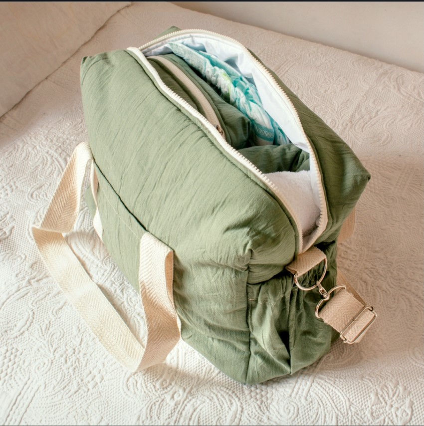 Presentamos el bolso maternal con neceser, confeccionado con tela de tusor de algodón y un relleno suave de guata. Este bolso ha sido diseñado pensando en tu comodidad y la de tu bebé.