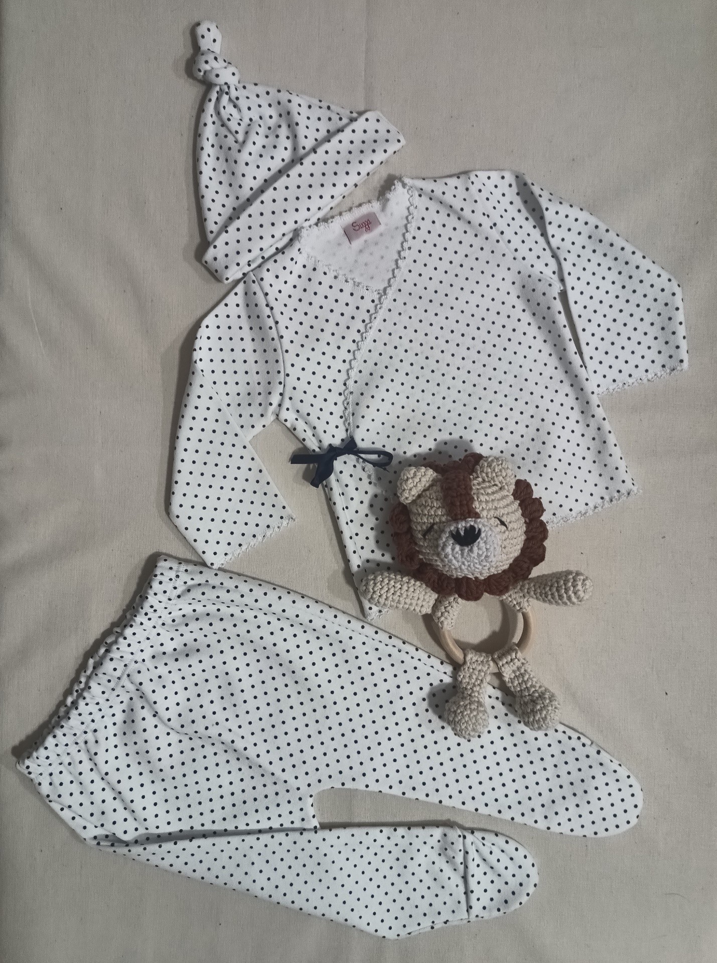 El saquito de mangas largas con cierre lazo negro y detalles en picots blancos aporta elegancia y practicidad. La ranita con piecitos asegura que tu bebé esté abrigado y cómodo durante todo el día, mientras que el gorrito con un delicado nudo completa el look tierno perfecto.